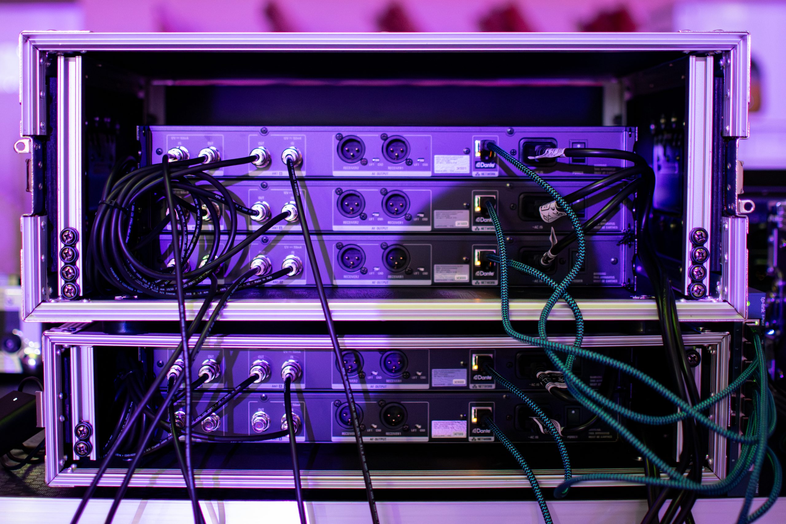 Die Theaterspielgemeinschaft Lorsch stellte an die drahtlose Sprachübertragung der Schauspielenden vor allem zwei Anforderungen: eine gute Sprachverständlichkeit und eine hohe Reichweite. Die Empfänger sollten am FOH-Platz installiert werden, damit die Techniker:innen das gesamte System im Blick haben und gegebenenfalls schnell reagieren können. Die 3000er Serie von Audio-Technica konnte alle Anforderungen erfüllen. Nils Engel von MR Products war mit der Installation der neuen Tontechnik betraut und erklärt: „Wir haben zuvor ein Test-Setup des Audio-Technica Systems aufgebaut und waren begeistert von dessen Signalstärke. Zwischen Bühne und FOH-Platz liegen etwa 20 Meter, das Signal wurde – trotz gefülltem Saal – einwandfrei und mit einer sehr guten Sprachverständlichkeit übertragen.“ Für die Bühnenmikrofonierung kommen zehn ATW-DT3101 Drahtlos-Sender sowie zwei zusätzliche ATW-DT3102 Handsender mit den dynamischen Wechselköpfen ATW-C4100 zum Einsatz. Für die Schauspielenden wurden außerdem zehn der BP899cH Kondensator-Lavaliermikrofone angeschafft, von denen sechs als beige TH-Variante ausgelegt sind. „Neben der wirklich guten Tonqualität der Mikros freuen sich die Schauspieler:innen auch über die neuen Beltpacks“, berichtet Engel. „Jeder Sender hat eine Digitalanzeige, in der die korrespondierenden Namen eingegeben sind. Die Schauspieler:innen können sich einfach selbst ihren Sender schnappen, ohne befürchten zu müssen, versehentlich den falschen zu benutzen.“ Zum Empfangen der Funkstrecken hat der Technikexperte fünf der Dante-fähigen Audio-Technica ATW-DR3120DAN Zweikanal-Empfänger installiert.