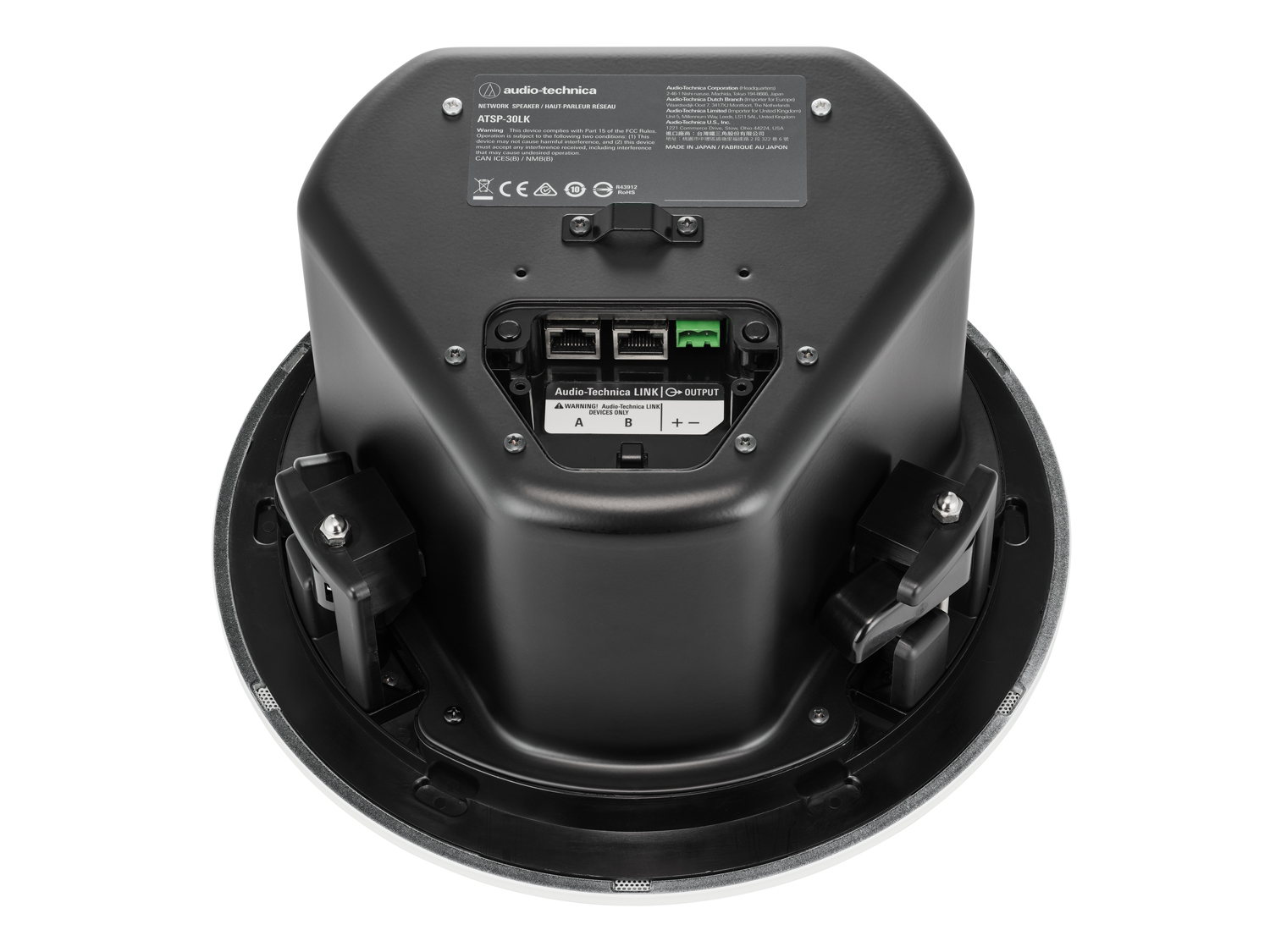 Los altavoces ATSP-30 se suministran en pares —uno activo y uno pasivo— que se conectan mediante cable de altavoz estándar. Se montan a ras en techos suspendidos o sólidos mediante el hardware incluido. Con un diámetro de 256,1 mm (10,4″), ocupan un espacio mínimo, pero ofrecen un sonido rico y equilibrado con un ángulo de cobertura de 140°. Su excelente reproducción de frecuencias bajas y medias los hace adecuados no solo para la amplificación de micrófonos, sino también para música ambiental y audio procedente de fuentes de vídeo. En instalaciones con varios pares de altavoces, es posible enviar señales de audio independientes a cada par, una ventaja clara para sistemas zonificados y reproducción de música ambiental.