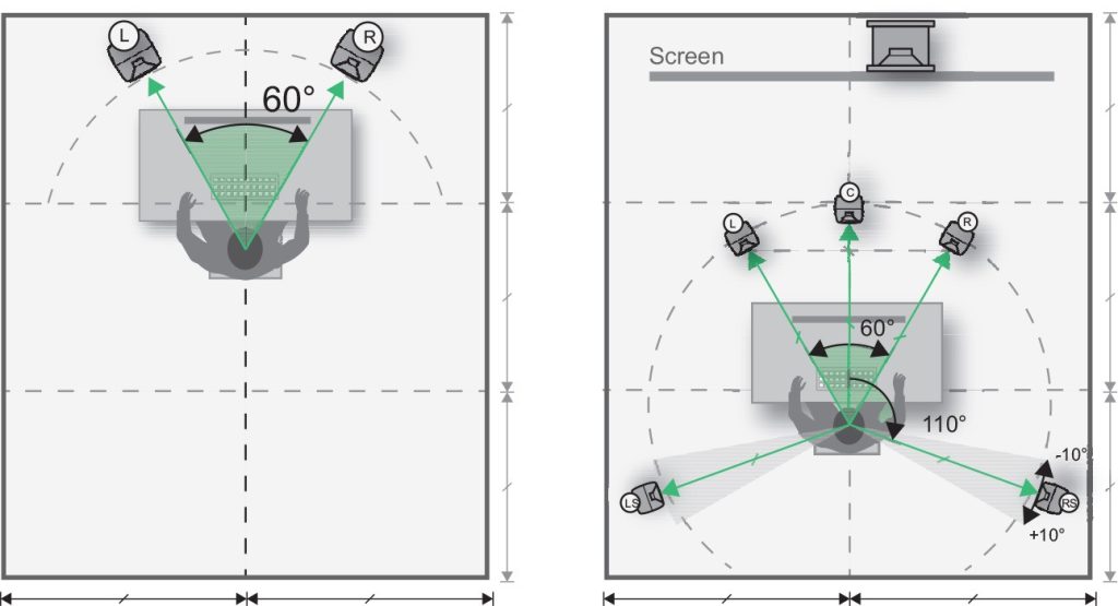 Sugerencias de colocación para una configuración de monitorización 5.1 en dos diseños básicos de habitación: