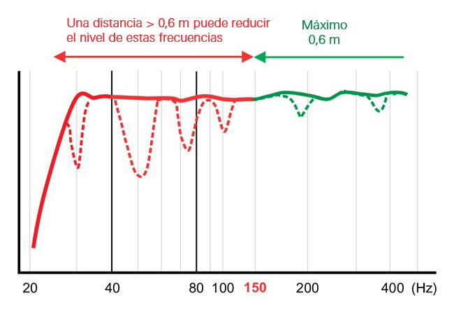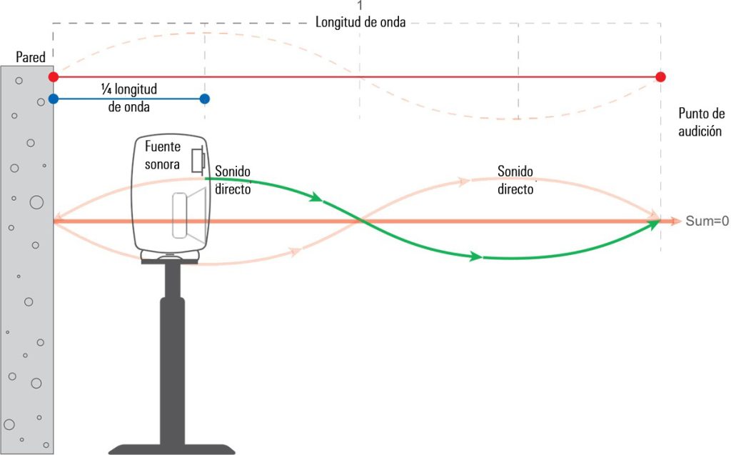 La distancia hasta la pared donde se colocan los monitores puede ser muy importante para la calidad del sonido. Cuando hay un espacio entre el monitor y la pared, a la frecuencia donde esta distancia es igual a un cuarto de la longitud de onda del sonido, la reflexión de la pared aparece desfasada con respecto al monitor y el sonido reflejado cancela el audio del monitor. A esta frecuencia, el nivel de sonido se reduce. La magnitud de la reducción producida depende de la distancia y de la cantidad de sonido que refleja la pared situada detrás del monitor.