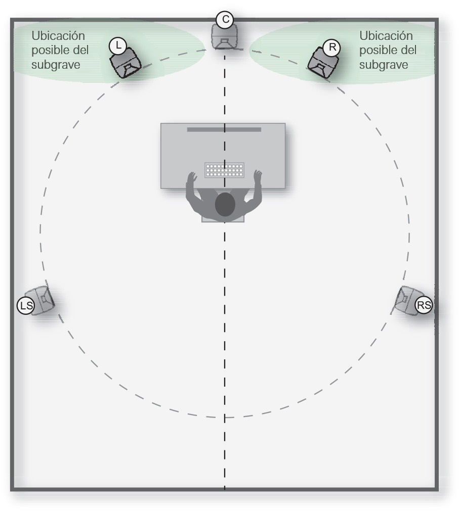 Colocar un subgrave en una pared o en una esquina produce mayor nivel en graves. A bajas frecuencias, se puede lograr la respuesta más plana cuando los modos de resonancia de la habitación están igualmente estimulados. Por lo general, se coloca un solo subgrave a lo largo de la pared frontal, ligeramente descentrado del eje medio de la habitación. También puede ser una buena solución colocar dos subgraves, para producir una respuesta incluso más plana. Tenga en cuenta que, durante el ajuste de niveles, el de salida del subgrave se ajusta al mismo nivel que el sistema de monitor principal.