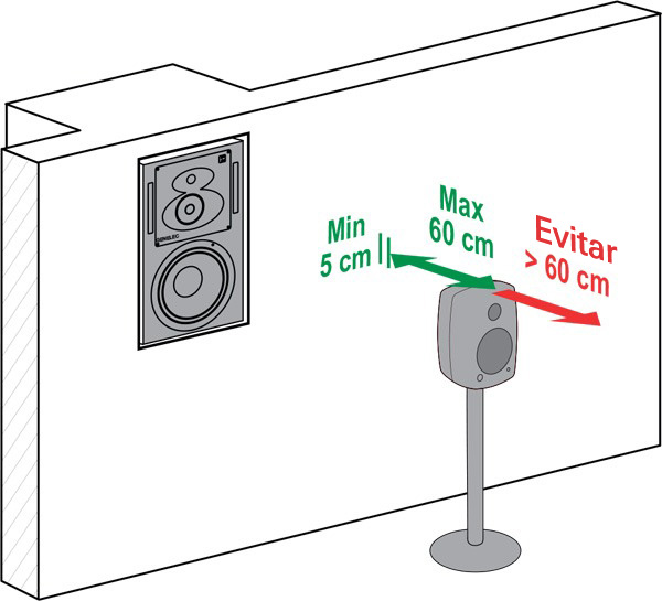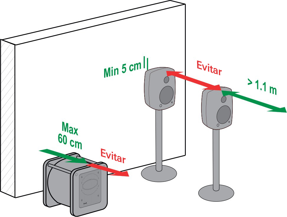 Para evitar la cancelación del audio debido al sonido que se refleja en la pared detrás del monitor, siga las instrucciones de colocación que se muestran a continuación. El reflejo de la pared solo se produce en frecuencias relativamente bajas del woofer. Es importante evitar la cancelación porque el sonido reflejado puede reducir la salida del woofer, lo que hace que la salida de baja frecuencia del monitor parezca demasiado baja, lo que da lugar, por ejemplo, a errores en la mezcla final en la producción musical. Para evitar la cancelación, coloque el monitor lo suficientemente cerca de la pared. Normalmente, la distancia entre la parte delantera del monitor y la pared debe ser inferior a 60 centímetros. Esto garantiza que no se reduzca la salida de baja frecuencia. Además, el monitor necesita una distancia mínima de 5 cm con respecto a la pared para garantizar la salida completa del puerto trasero de reflejo de graves.