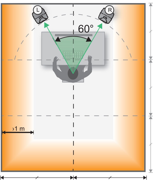 Divida la sala verticalmente en tres áreas de igual tamaño: delantera, central y trasera. Para la producción de música, coloque su sistema de audición en el área frontal. El ángulo entre los monitores izquierdo y derecho debe ser de 60 °. Cada monitor debe apuntar hacia la posición de escucha. Para la producción de películas, coloque su sistema de audición en el área trasera.