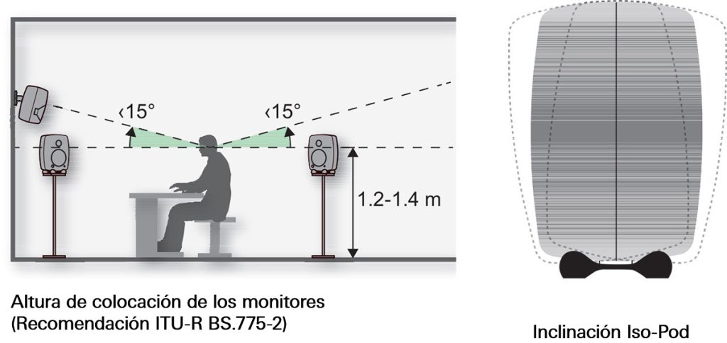 Para sistemas típicos de dos vías, la altura recomendada para el eje acústico del monitor se sitúa a la altura del oído, normalmente entre 1,2 y 1,4 metros del suelo. Colocar los monitores a una altura superior con una ligera inclinación minimiza las reflexiones del suelo. Para reproducción estéreo y multicanal estándar, no eleve los monitores de forma que sea precisa una inclinación superior a los 15 grados. Los monitores siempre deben ser orientados hacia el punto de audición. Cuanto más grande es la distancia entre el suelo y el monitor, menor es la reflexión inducida por irregularidades en la respuesta en frecuencia. Sin embargo, debe evitarse la colocación de los monitores en la mitad de la altura de la habitación ya que, a bajas frecuencias, el techo suele ser también una superficie reflectante.