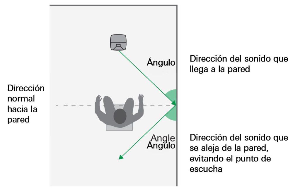 Si las superficies de la habitación no se han diseñado para difractar el sonido, la mayor parte de la energía del sonido reflejado sale de la pared reflectante en el mismo ángulo en que llegó a la pared. Evite colocar los monitores de modo que las reflexiones procedentes de la pared lateral más próxima, el techo y el suelo viajen hacia el punto de escucha.
