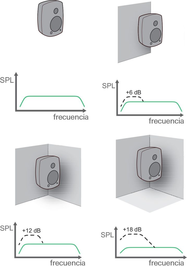 Un monitor con una respuesta en frecuencia plana, en espacio abierto produce un nivel de sonido hasta 6 dB más alto cuando es colocado contra una pared sólida. En una esquina (dos paredes), esta ganancia puede ser de 12 dB. Con tres superficies (esquina cerca del techo) la ganancia puede ser de +18 dB. Esto puede apreciarse especialmente en las frecuencias bajas.