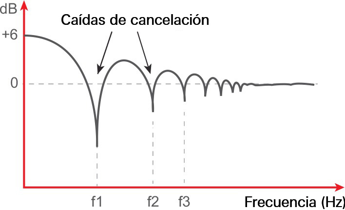 El sonido es reflejado por las paredes, el techo y el suelo. El nivel de sonido en la posición del oyente aumenta cuando el sonido reflejado se encuentra en fase con el sonido directo. El nivel del sonido disminuye cuando el sonido reflejado se encuentra fuera de fase con el sonido directo.